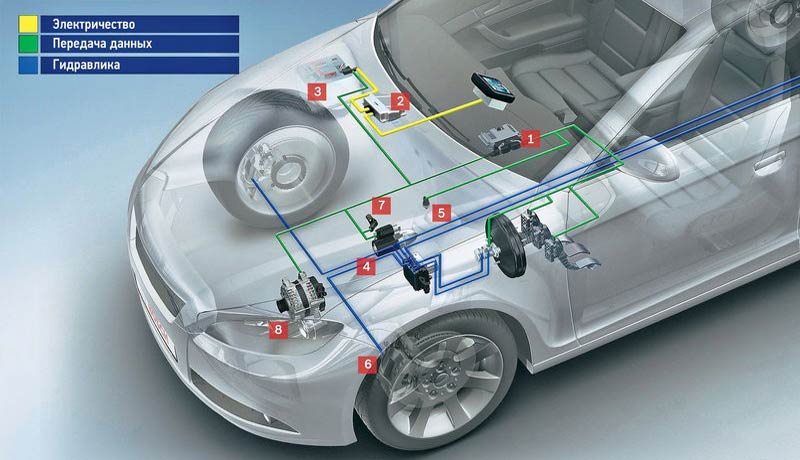 Система полностью базируется на электронных датчиках и блоке управления мотором, причем датчики расположены на всех ведущих узлах автомобиля: колесах, аккумуляторе , коленвале, коробке передач, генераторе .