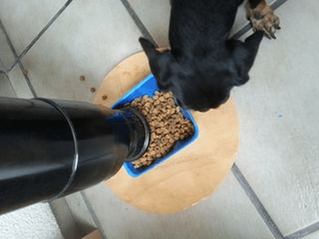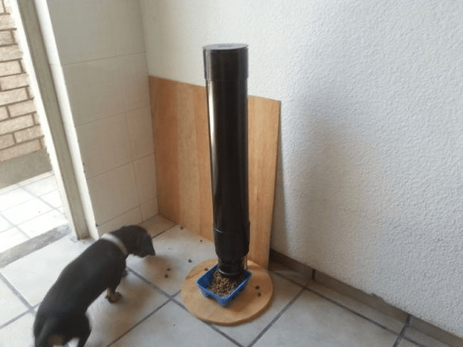 Кормушка готова. Можно теперь поставить тарелку под нижнюю часть кормушки. Снять сверху заглушку, насыпать внутрь корм. Закрыть заглушку. Теперь можно не переживать что собака останется голодной.