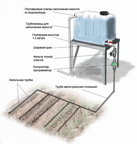 При отсутствии централизованного водопровода одним из главных недостатков данной системы полива является потребность в осуществлении постоянного контроля за процессом наполнения водой накопительной емкости.
