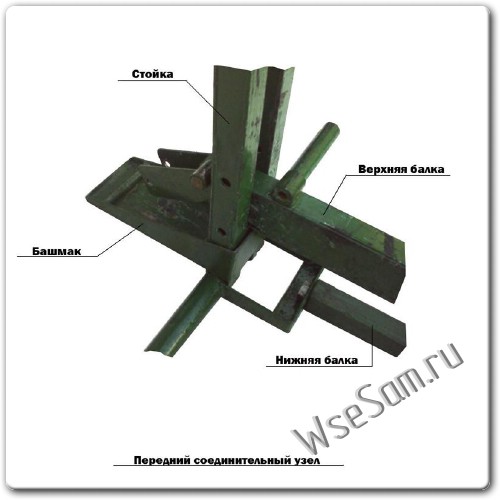 «Башмак». Изготавливается из металлического листа шириной 3-4 мм и металлического штыря, диаметр которого около 12 мм. Для создания этой детали своими руками достаточно приварить штырь к пластине. Деталь необходима для фиксации домкрата.- Задняя балка. Потребуются 4 уголка длиной 1.5 м. Уголки с помощью струбцины соединяются в квадрат, в который затем вставляется металлический стержень и закрепляется электрозаклёпками (точечной сваркой).