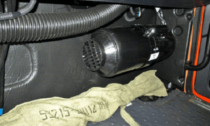 Работает этот воздушный автономный отопитель следующим образом. Так, при помощи топливного насоса в камеру сгорания «Планара» подается топливо. То тепло, которое вырабатывается от сгорания дизеля, затем передается на теплообменник. Затем радиатор обдувается и горячий воздух попадает в кабину. Отработанные газы выводятся из салона машины (через трубу, как на фото ниже). Также устройство подходит для эксплуатации в закрытых помещениях. В качестве топлива для «Планара» используют дизельное топливо. Как уже было замечено, оборудование может работать полностью автономно – двигателю авто работать необязательно. Особенности монтажа заключаются в том, что сам «фен» находится внутри кабины, а бачок с горючим — на улице.