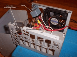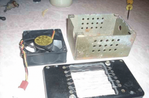 Наиболее распространенной и доступной для реализации конструкцией отопителя является схема, состоящая из 12-ти вольтного вентилятора-кулера, используемого в блоках питания и системах охлаждения компьютеров и нагревательной панели. Последняя изготавливается в виде рамки или трубки из негорючего и диэлектрического материала. Подойдут элементы крышек и корпусов мощных электрических пускателей из текстолита или стеклотекстолита.