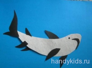 Расположим туловище на синем фоне и уравновесим композицию, пусть акула будет посередине листа. Вырежем характерный акулий хвост с большой верхней лопастью. Приложим хвост к акульему туловищу следя чтобы не нарушить композиционное равновесие. К спине приставим огромный плавник,как парус. Вырежем пасть – она должна выйти как бы под углом, акула ведь повернута к нам боком, а не анфас. Возле угла рта находится маленький глаз. Вырежем и приложим к своему месту крошечную ноздрю, и жаберные щели.