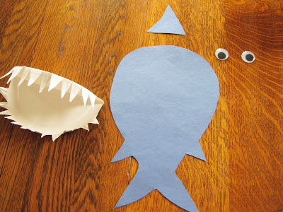 Вырезаем из цветной серо-голубой бумаги тело будущей акулы и плавник-треугольник. Приклеиваем на тело акулы плавник, глазки. Сгибаем нашу одноразовую тарелку вдвое и на сгибе приклеиваем ее на тело акулы.