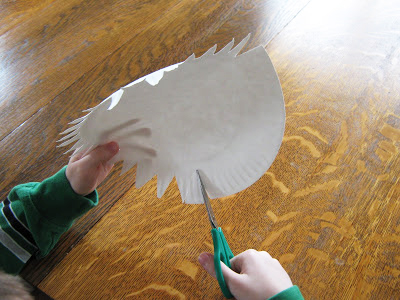 Для начала сделаем нашей акулы рот. Берем ножницы и . Вырезаем треугольники по всему краю тарелки.