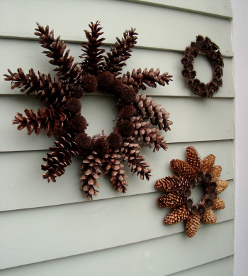 Если на картонную основу в форме круга приклеить шишки разной формы и размера, то получится новогоднее украшение — венок. Правда, шишек потребуется очень много, поэтому запаситесь ими заранее. Готовый венок можно покрыть краской.