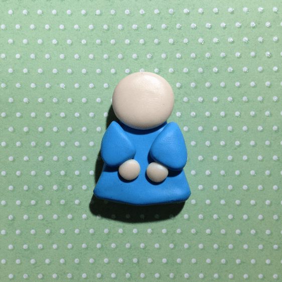 - Из бежевого материала нужно скатать такой же аккуратный шарик, только меньше размером – пальцами осторожно сомните его, чтобы стал плоским – это голова ангела. Из остатков голубой полимерной глины нужно сформировать два аккуратных треугольника – рукава платья. Вот что мы получаем на этом этапе: