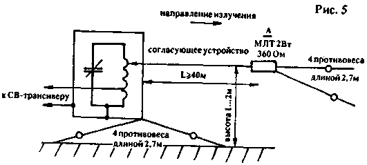 Если Вы хотите связаться с места рыбалки или охоты, желательно использовать антенну Бевереджа (рис.5). Сама антенна должна иметь длину полотна не менее 40 метров (можно больше) и может быть выполнена из провода диаметром 0,5-1 мм. Провод может быть подвешен на небольшой высоте над землей — 1-2 метра. На конце нагрузки антенны и на согласующем устройстве желательно использовать 3-4 противовеса.