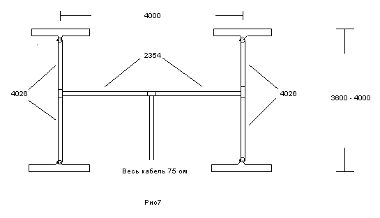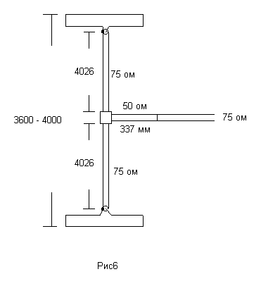 Если вы хотите работать через Луну и т.д., где потребуется иметь прижатый лепесток к горизонту то необходимо воспользоватся рис6. На рисунке приведены размеры при согласовании антенн расположенных в 2 этажа. Везде применен кабель 75 ом, за единственным исключением, чтобы согласовать питающий 75омный кабель и точку соединения верхнего и нижнего этажей необходим трансформатор роль которого и играет отрезок 50омного кабеля длиной равного 337 мм. Расстояние между антеннами должно быть равно от 3,6 до 4,0 метра.