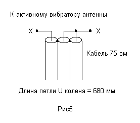 В точки питания XX можно также подключить полуволновую петлю из коаксиального кабеля для согласования антенны с несимметричным коаксиальным кабелем, волновое сопротивление которого 60 ом (эта же схема осуществляет дополнительно и симметрирование коаксиального кабеля).