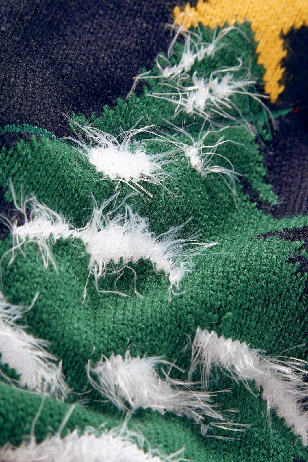 Аппликация на вязаном свитере. Лыжи — кожаные вставки, шапка пингвина — ткань, шарф — трикотаж. Но особенно мне понравился снег на елке. Это шерсть с длинным ворсом. Вот это чудо поближе.