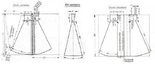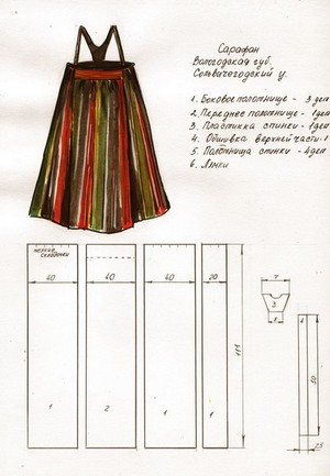 Выкройка русского народного костюма для девочек, девушек достаточно проста. Сарафан, сшитый на основе прямоугольника, собранного по линии груди на резинку. К нему пришиты бретели. И блуза свободного покроя.