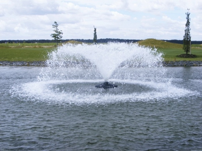 - поверхностные. Это устройства, функционирующие над водной гладью. Они производят поверхностные потоки, фонтаны, небольшие водопады. Агрегаты используют не только для аэрирования, но и создания ландшафтного элемента. Модели данного типа подходят для декоративных водоемов, в которых нет рыбы. Движущаяся вода создает шумовой эффект, который вызывает стресс для водных обитателей. Принцип действия основан на всасывании жидкости насосной станцией и выбросе ее обратно. Перемешивание и перемещение водных потоков в воздухе насыщает объект кислородом;