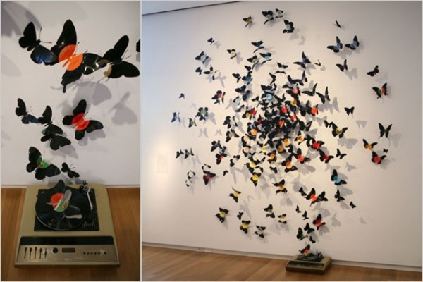 Также интересно будут выглядеть бабочки, сделанные из виниловых пластинок. Чтобы их сделать, нужно обвести шаблон бабочки на пластинке с помощью белого карандаша и нагреть ее в духовке, подержав пластинку там не более 45 секунд. Когда винил станет мягким, вырезайте бабочку и придавайте ей форму. Не исключено, что процедуру подогрева для каждой бабочки нужно будет повторять по нескольку раз. Ведь этот материал так же быстро остывает и твердеет, как и нагревается.