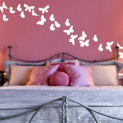 Это простейший способ посадить на стены порхающих красавиц. Основой для декора может послужить обычная или цветная бумага. Рисунок можно нарисовать вручную или создать при помощи графических программ на компьютере. Весомый плюс данного метода – низкая цена материала.