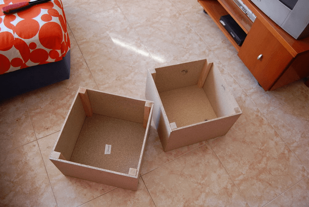 - Все детали последовательно склеивают столярным клеем и дополнительно скрепляют саморезами. По окончании монтажа получится конструкция из 3 кубов с открытой стороной.