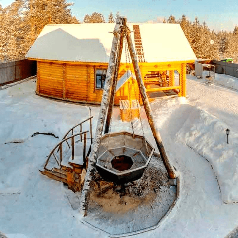 - На подготовительном этапе перед установкой чана необходимо учесть все нюансы. Человек, находящийся в такой купели, должен чувствовать себя уютно и комфортно. Если чан планируется располагать на открытой площадке, чтобы полноценно насладиться уединением с природой, то следует побеспокоиться о защищённости от посторонних взглядов. Кроме этого, подход к чану должен быть удобным.