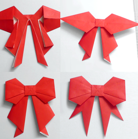 Вот бантик из бумаги в технике оригами посложнее. Начальная заготовка делается из квадрата загибанием двух противоположных углов к центру. Далее смотрите пошаговую схему выполнения:
