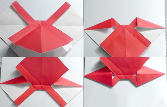 Переворачиваем фигуру и два боковых крыла загибаем. При этом угол крыла ложится под наш только появившийся крохотный квадрат.