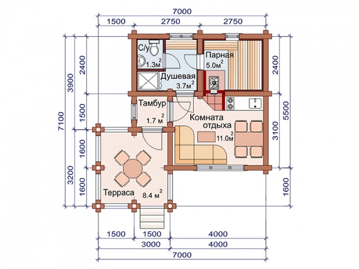 Классическая русская баня 4 на 5 состоит из санузла, парной и комнаты отдыха.