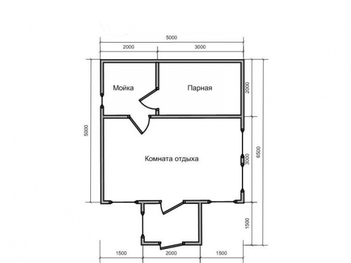 Чтобы напрасно не ломать голову над созданием чертежей с нуля, можно взять за основу любой готовый проект, с планировкой, соответствующей необходимой площадки застройки и просто внести в неё коррективы. К примеру, планировка каркасной бани размером 5 на 5 метров, как на фото: