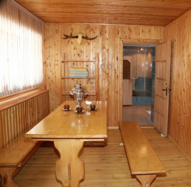 Внутренняя отделка требует особого подхода. Прежде всего – нужно правильно выбрать вагонку. Для комнаты отдыха и предбанника подойдёт сосновая вагонка. Она не требовательна к уходу и выглядит довольно привлекательно, как на этом фото: