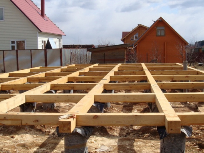 После установки опорных столбов, на них закрепляется обвязка из бруса. Детали скрепляются между собой гвоздями. Под обвязку обязательно монтируется гидроизоляция из рубероида. Как на фото: