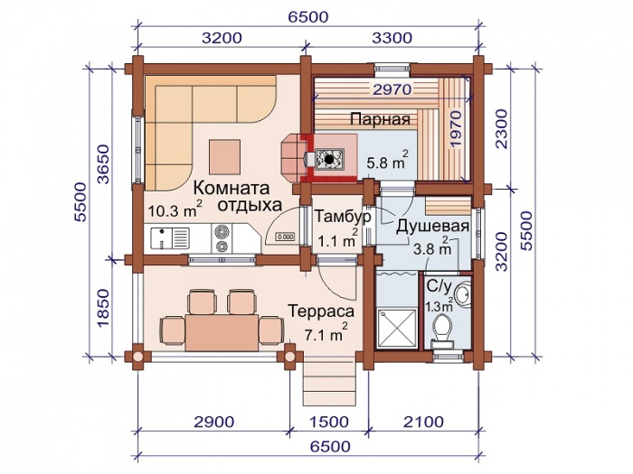 Внутренние помещения каркасной бани должны быть спроектированы так, чтобы вмещать необходимые предметы мебели. К примеру, планируя парную в бане важно заранее определиться с размерами печи и лавочек. В комнате отдыха нужно предусмотреть пространство, достаточное для установки стола и кресел или диванов. Необходимо продумать наличие предбанника, который предотвратит попадание холодного воздуха в зимнее время. В помывочной важно заранее определиться с габаритами душа и наличием бассейна или бочки.