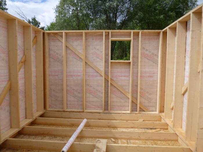 Промежуточные стойки желательно устанавливать с шагом, соответствующим размеру заготовок (плит) выбранного вами утеплителя. Кроме того, при их установке следует ориентироваться на участки, где будут располагаться проемы для окон и дверей, а также места примыкания простенков.