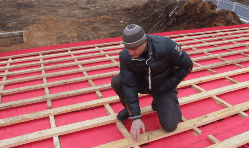 С помощью анкерных болтов нужно установить на стены мауэрлат, собрать стропила и закрепить ее. Обшить стропильную конструкцию досками, сделать паро- и теплоизоляцию.