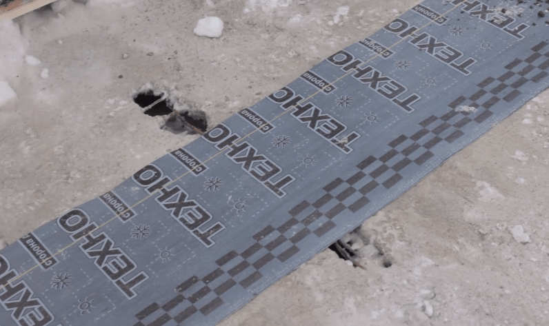 Перед кладкой первого ряда нужно сделать гидроизоляцию. Для этого необходимо на основание нанести слой расплавленного битума, а сверху постелить два слоя рубероида. Если нужно выровнять пол, можно сделать стяжку.