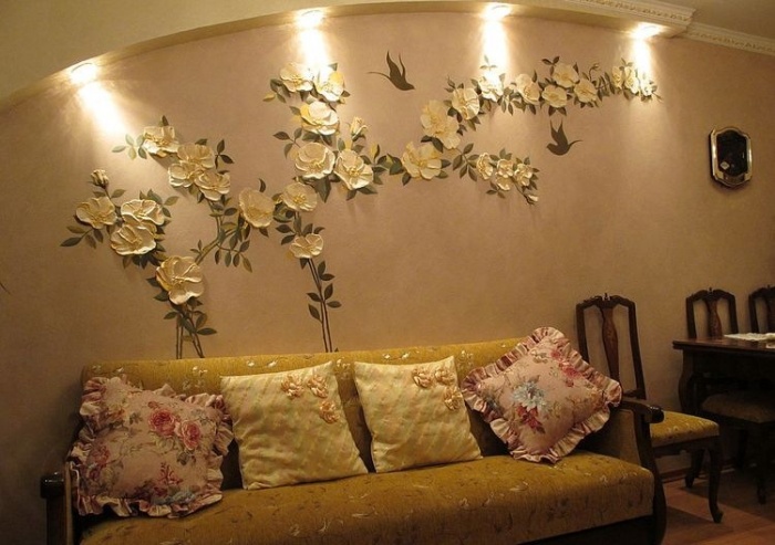 Профессионалы рекомендуют подбирать для готовых объемных декоров дополнительную подсветку. Она позволит выделить в выгодном свете картину либо фотографию.