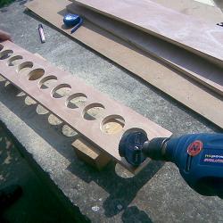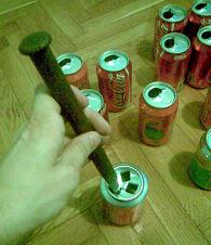 При помощи коронки по металлу необходимо в каждой банке вырезать дно. Отверстие должно быть диаметром 44 мм. Удобным при этом будет воспользоваться сверлильным станком. Прикрепленная в нижней части станка коронка (диаметр 51 мм) не даст возможности пивной банке прокручиваться и мяться в руках.