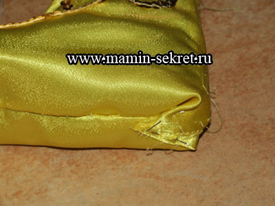 Укладываем получившуюся заготовку в «калошу» лицевой стороной вниз и пришиваем по краю, выворачиваем атласной стороной наружу.