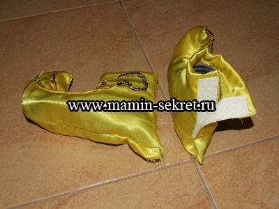 Переводим ее на ткань и пришиваем узкой частью к верхней части башмачков.