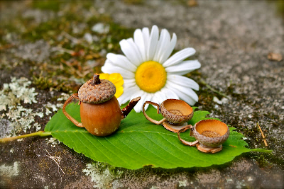 - Теперь в своей коллекции найдите несколько дубовых крышек. Возьмите: целую крышечку, половинку крышки и одну крышку в плодоножкой.