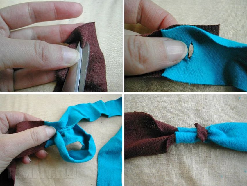 Для красивого плетения косички важно делать чистые соединения тряпичных лент между собой. Это можно сделать, например, следующим образом: