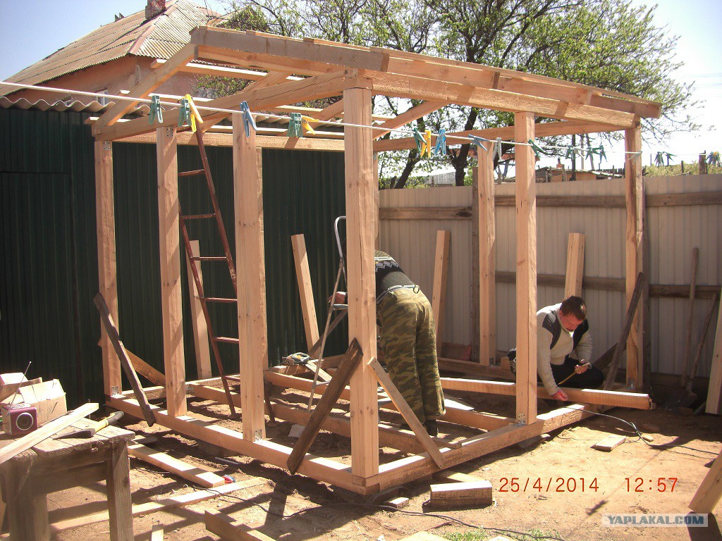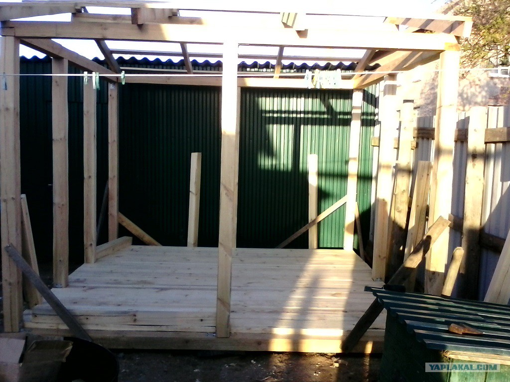 Ура! Закончили скелет беседки. Убрали времянку — стоит, но не совсем крепко. Надеюсь, стропила крыши и пол окончательно «свяжут» конструкцию.
