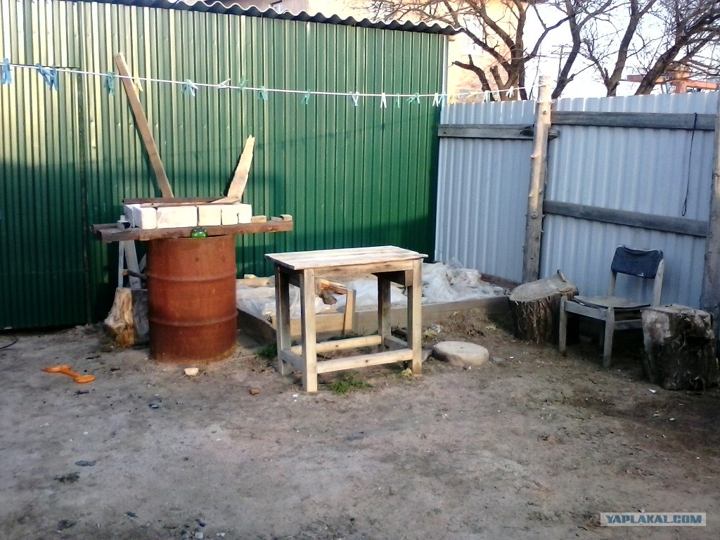 Купили материал: 12 метров бруса (50х70) и 12 метров доска 25-ка — всего на 400 рублей. Дубовый стол вкопали более чем на метр — так что на столе можно будет танцевать…