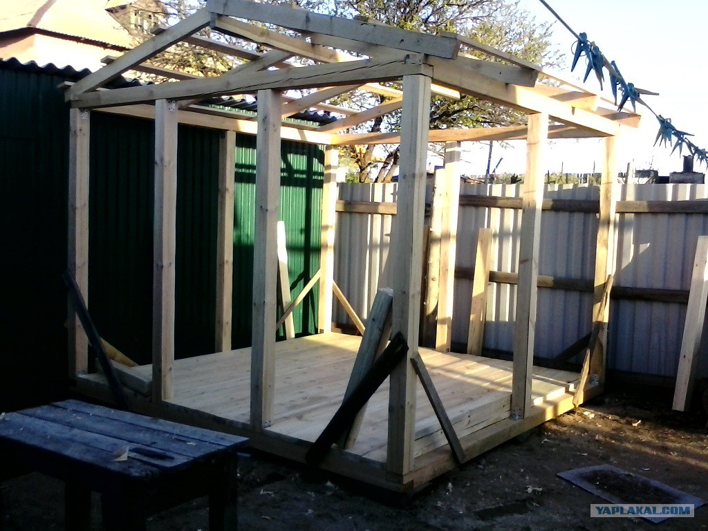 Рекомендуется использовать поддоны хорошего качества, чтобы они смогли выдержать нагрузку крыши. Стропильную систему можно зафиксировать после установки всех стен или после установки опорных брусьев. Крышу можно сделать из гибкой кровли, поликарбоната или шифера. Полы нужно обработать специальным средством, чтобы избежать гниения и появления грибка.