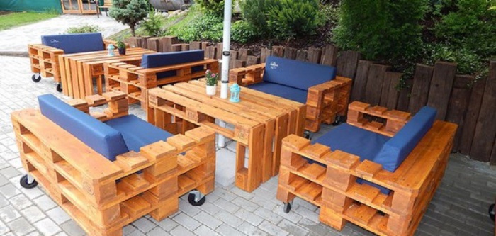 В беседке очень часто размещают мебель, также сконструированную из поддонов. Самыми распространенными являются конструкции столов, журнальных тумбочек и т.д. Материал может быть использован не только в качестве столешницы, но и ножек, к которым затем можно прикрепить колесики.