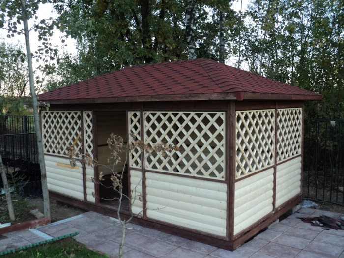 Представляет собой более основательную конструкцию, но также не особо сложную для самостоятельного возведения. Главным удобством такой постройки является возможность утеплить ее и сделать всесезонным местом отдыха. Однако решение в пользу постоянного или временного ее использования следует принимать на этапе проектирования, чтобы включить в план-схему постройки окна, двери и прочие дополнительные нюансы. А также не забывайте, что у такой прочной беседки обязательно должен быть основательный фундамент.