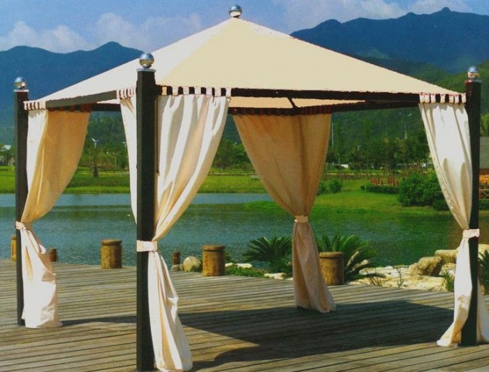 Минусами такой беседки будет слабая устойчивость к ветру, сравнительно небольшие габариты, отсутствие стен.