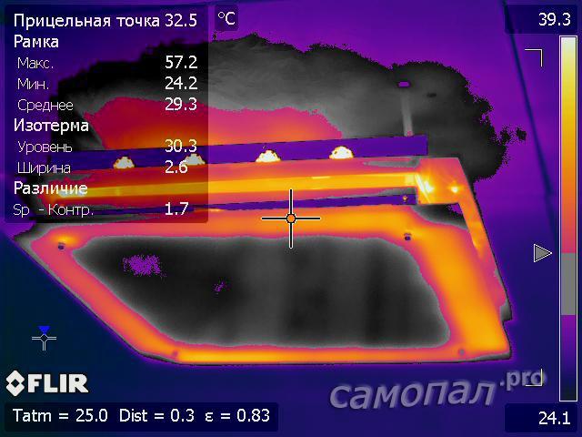 Тепловизор показал довольно равномерное нагревание светодиодов с максимальным нагревом кристаллов 58С