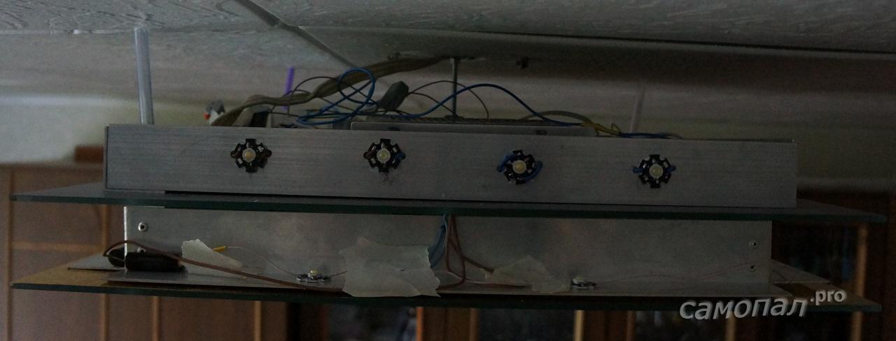 - Закрепить изнутри светодиодную RGB-ленту. Для этого шнур питания нужно просто протянуть через предварительно просверленные отверстия.
