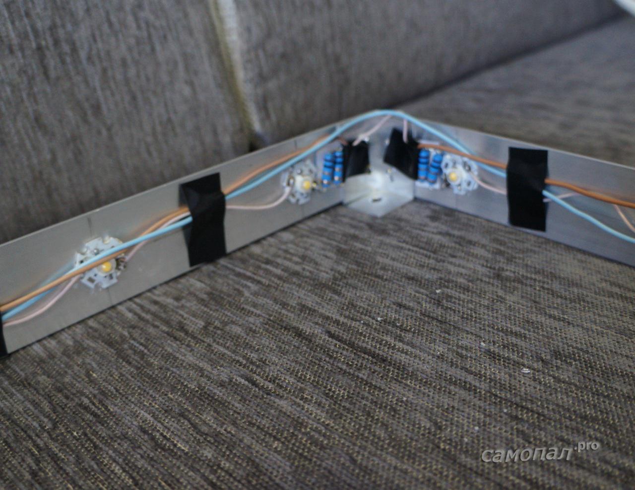 - Возьмите RGB светодиодную ленту, и аккуратно прикрепите на поверхность каркаса изнутри, шнур питания проведите через отверстие в рейке, которое необходимо сделать перед сборкой каркаса.