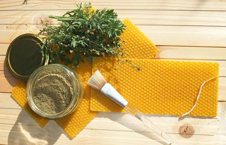 Пчелиный воск растапливается на водяной бане и смешивается с травами которые вы пожелаете: зверобой, чабрец, полынь, мята, душица, мелисса, шалфей и т.д.