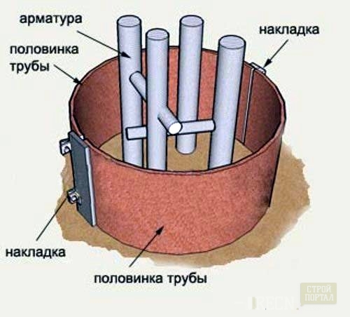 Подобная опалубка представляет собой отрезок трубы до 1 метра в длину. Трубу разрезают вдоль, с одной стороны по всей длине приваривается металлическая полоса для того, чтобы части трубы не разъезжались. Затем скрепить части парой-тройкой хомутов, или же приварить уголки-ушки, которые скрепляются болтами.
