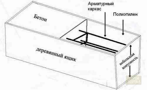 Вдобавок, дабы исключить разбухание древесины (во время заливки формы бетоном), желательно обеспечить защиту стенок короба при помощи полиэтиленовой пленки или листового материала (пластика, железа).