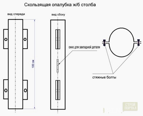 Железобетонные столбы могут исполняться в виде скользящей опалубки. Для этого нужно разрезать трубу на две части и приварить к ней косынку под соединительный болт. Длина опалубки должна быть около 1-1,5 м. Чтобы опалубку было легче разобрать, половины трубы смажьте маслом.
